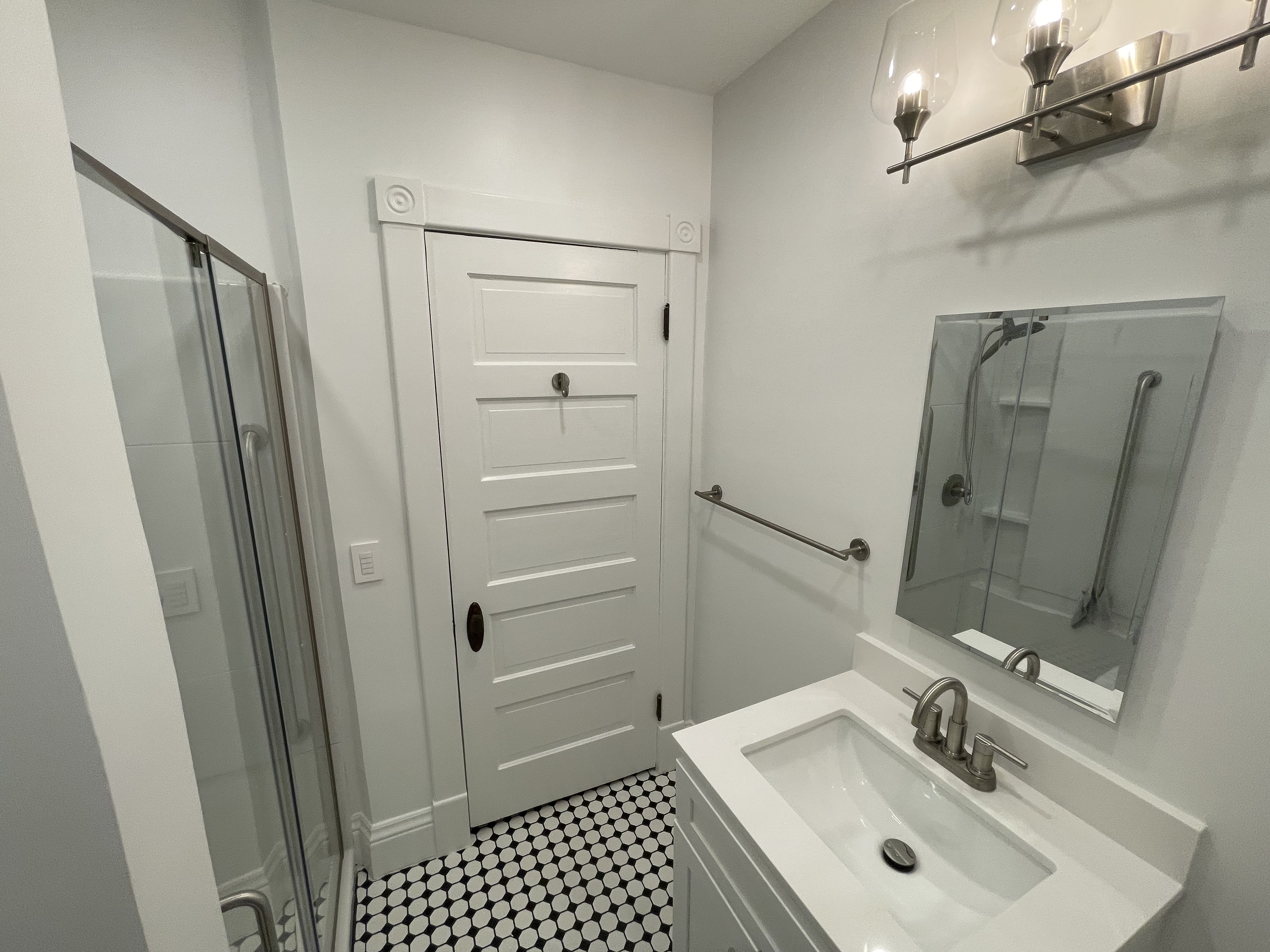 The family room in this 1970s house had wood paneling and an older laminate floor. Owners wanted a change. Took down the paneling upgraded the insulation to r15 rockwool for insulation and acoustics, drywalled, painted, fixed steps going down into room and did some improvements to the shelf above the fireplace. After installing a moisture barrier from slab beneath, high quality Pergo flooring was installed. I stained both the shelf and steps. Premium eggshell paint was used for the walls and semi-gloss enamel for the trim, door and baseboard heaters. Recessed lighting was also installed. This all made for a more modern and refreshed space!